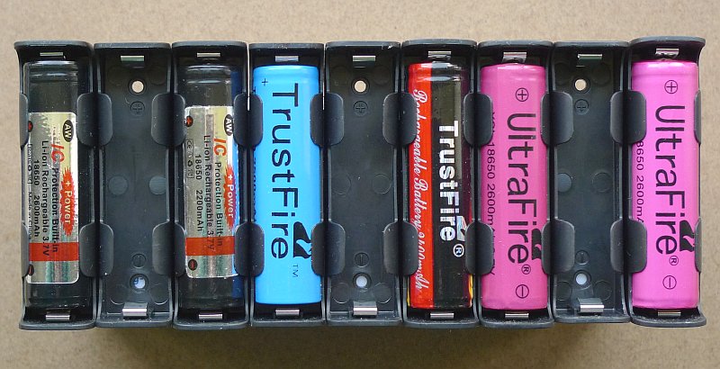 Der Akku ganz rechts (billige Variante des Ultrafire XSL 2600mAh) ist mein längster 18650er, man sieht deutlich wie sich die Enden des Halters nach aussen biegen.