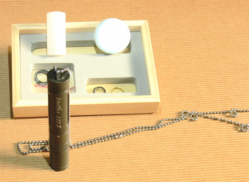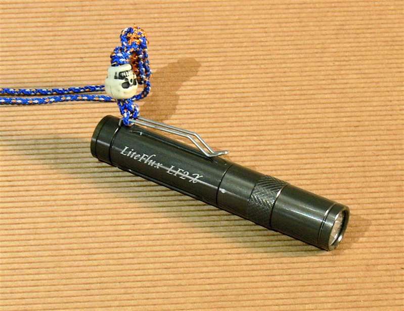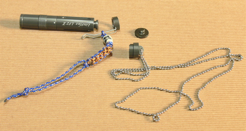 Ebenfalls gut ist das Mitgelieferte Zubehör, ein Anschraubbares Endstück mit Taschenclip, ein Endstück mit Öse durch die eine ebenfalls zu Zubehör gehörende Kugelkette gezogen werden kann. Eine dünnere Schnur, Multicord etc. sollte ebenfalls gehen.