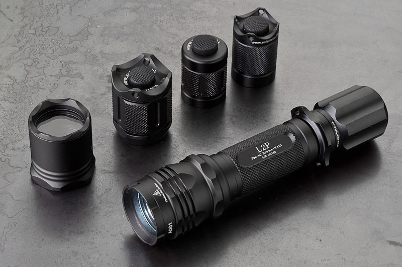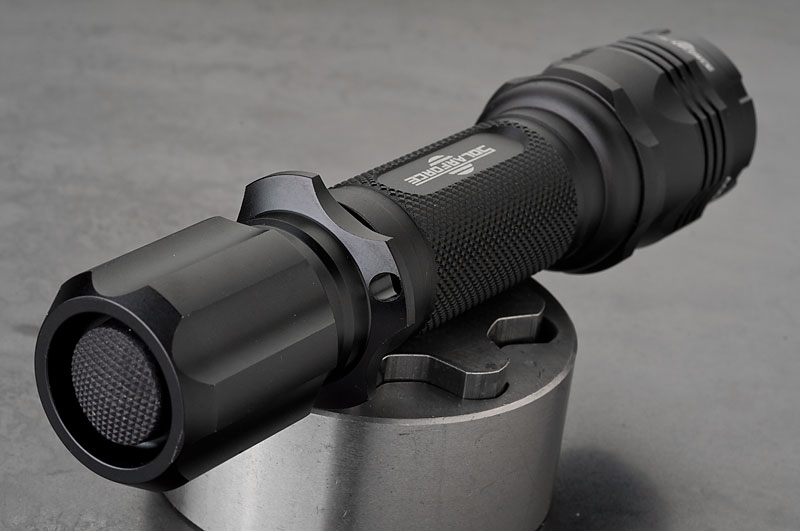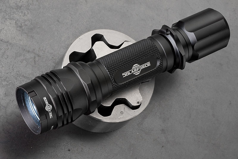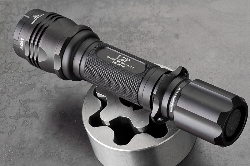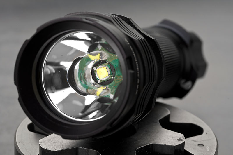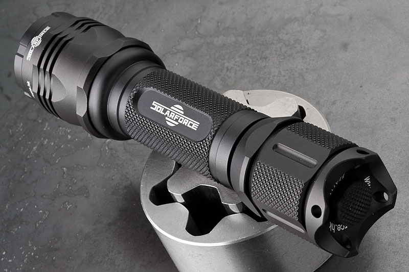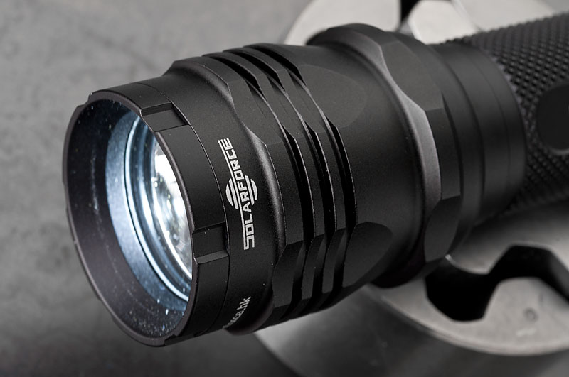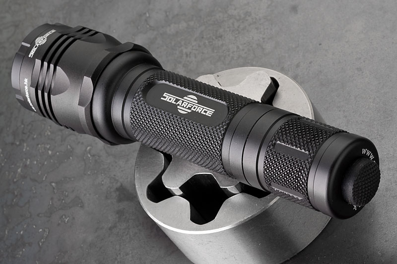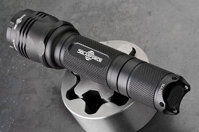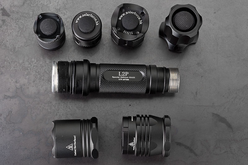 Body wurde mal wieder die Solarfoce L2P mit HAIII Hartanodisierung. Neben dem Standardschalter und -kopf, hab ich noch ein paar Schalter und einen hübscheren Kopf bestellt. Dazu ein XM-L Dropin, 3 Stufen (High, Med, Low) Betrieb mit 3-6V, angegeben mit 820 Lumen. Jaja. Ist jedenfalls hell genug
