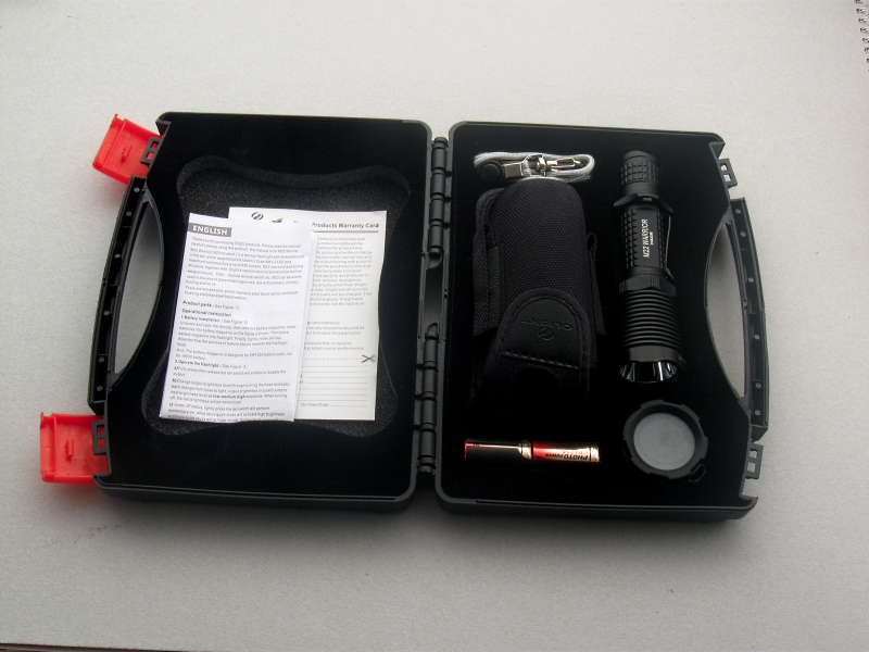 Lampe, Lanyard, Hülse zur Verwendung von 2xCR123, Holster, Diffusor und ein Säckchen (nicht im Bild) mit Ersatz-Oringen