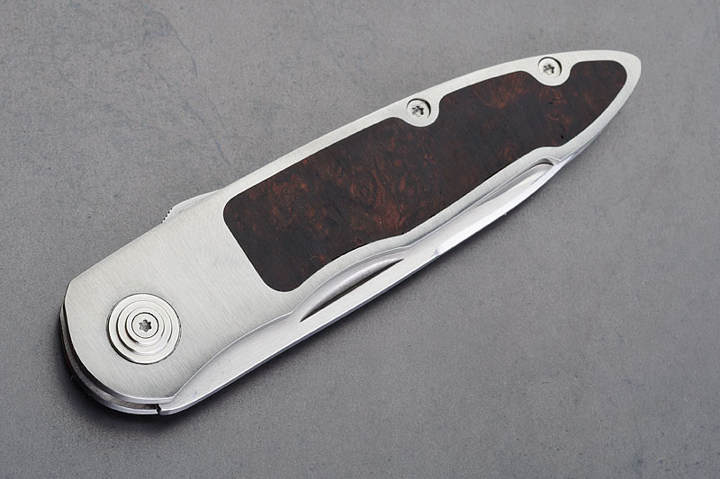 Edelstahlplatinen (auch quer satiniert) sitzen passgenau Einlagen aus Rosenholz - ich finds hübsch gemacht, dass die Einlagen auch der