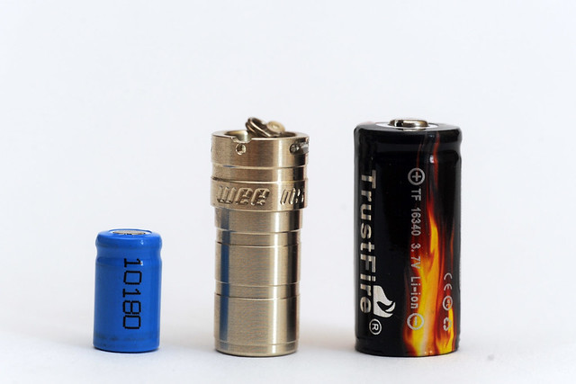 Um euch die Größe besser vorstellen zu können, eignet sich ein 16340er Akku. Mein protected trustfire ist sogar ein Stückchen länger als die winzige Wee.