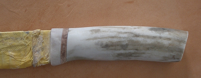 Die Klinge wollte ich nun endlich mal aus einem edleren Material nachgebauen - Sb1 - mit neuem Griff aus Rentier/Elch. Beim bestellen des Blechteils hatte ich dann eine wahnsinnig gute Idee. Ich bestelle nicht das Blech und quäle (mit Eisen hab ich`s nicht so) mich damit ab, nein: Ich schicke das Messer zum Sb1 Lieferanten und lass das Blech gleich zum Messer zurecht schleifen, das spart Transportkosten. Das mach ich jetzt immer so