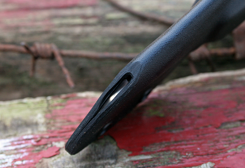 Wie bereits weiter oben schon angesprochen machten sich nach einigen angespitzten Ästen die ausgeprägten Daumenrillen bemerkbar. Etwas feinere Rillen wären dem Daumen für langes kraftintensives Arbeiten etwas zuträglicher, jedoch wirken die 6mm Bohrungen zum Gesamtkonzept und Design stimmig. So muss man an dieser Stelle mit ein paar Druckstellen leben oder den Daumen, bei längerem Einsatz, etwas weiter vorne auflegen.