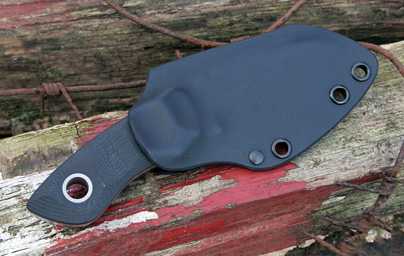 Eine ordentlich gearbeitete Scheide ist sehr wichtig. Ein scharfes Messer sollte man auch zuverlässig und sicher am Körper transportieren können. Ausgestattet ist das Pry-Mate mit einer Kydexscheide. Diese orientiert sich am Messerdesign. Auch das Custom Pry-Mate besitzt eine Kydex. Verwendet wurde Material in 2mm Stärke.