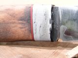Ich versuchte mich mal mit einer San-Mai Klinge aus zwei Lagen 08.15 INOX und einer Schneidlage CK85 im Feuer verschweisst. Die drei Lagen wurden rundum mit Schutzgas (MAG) verschweisst und anschliessend in der Gasesse Feuer-verschweisst, klappte richtig gut. Die drei Lagen a je 3mm, total 9mm, wurden auf 2.8mm ausgeschmiedet und in eine Bowieform gebracht. Unter Zuhilfenahme eines Reststückes Pudeleisen, etwas Rotem Fiber und einem Stück amerik.Nussbaum, entstand ein handliches Messerchen.