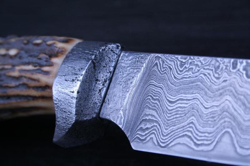 Die Klinge ist aus 151 Lagen 1.2842 & 75Ni8 mit einer Schneidlage aus 1.2442.