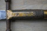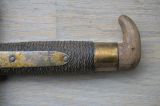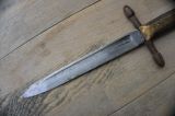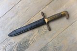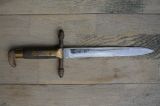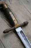 Hallo zusammen, sein kurzem besitze ich dieses alte Dolchmesser(?). Es ist sehr schön verarbeitet, leicht und gut ausbalanciert. Die Scheide scheint aus einem in Harz (oder ähnlichem) getränkten Leinenstoff gefertigt zu sein, welcher wohl beidseitig mit Holzschienen verstärkt ist. Ungewöhnlich finde ich das Parier, welches aus Holz gefertigt ist. Es scheint viel benutzt worden zu sein, denn der Griff und das Holz sind recht speckig. Ich frage mich nur, wofür es benutzt wurde, denn fürs Wurstschneiden finde ich es doch etwas unüblich. Hat jemand eine Idee zu Nutzen, Herkunft und Alter? Es würde mich brennend interessieren. Danke schonmal! Grüße Abeggs