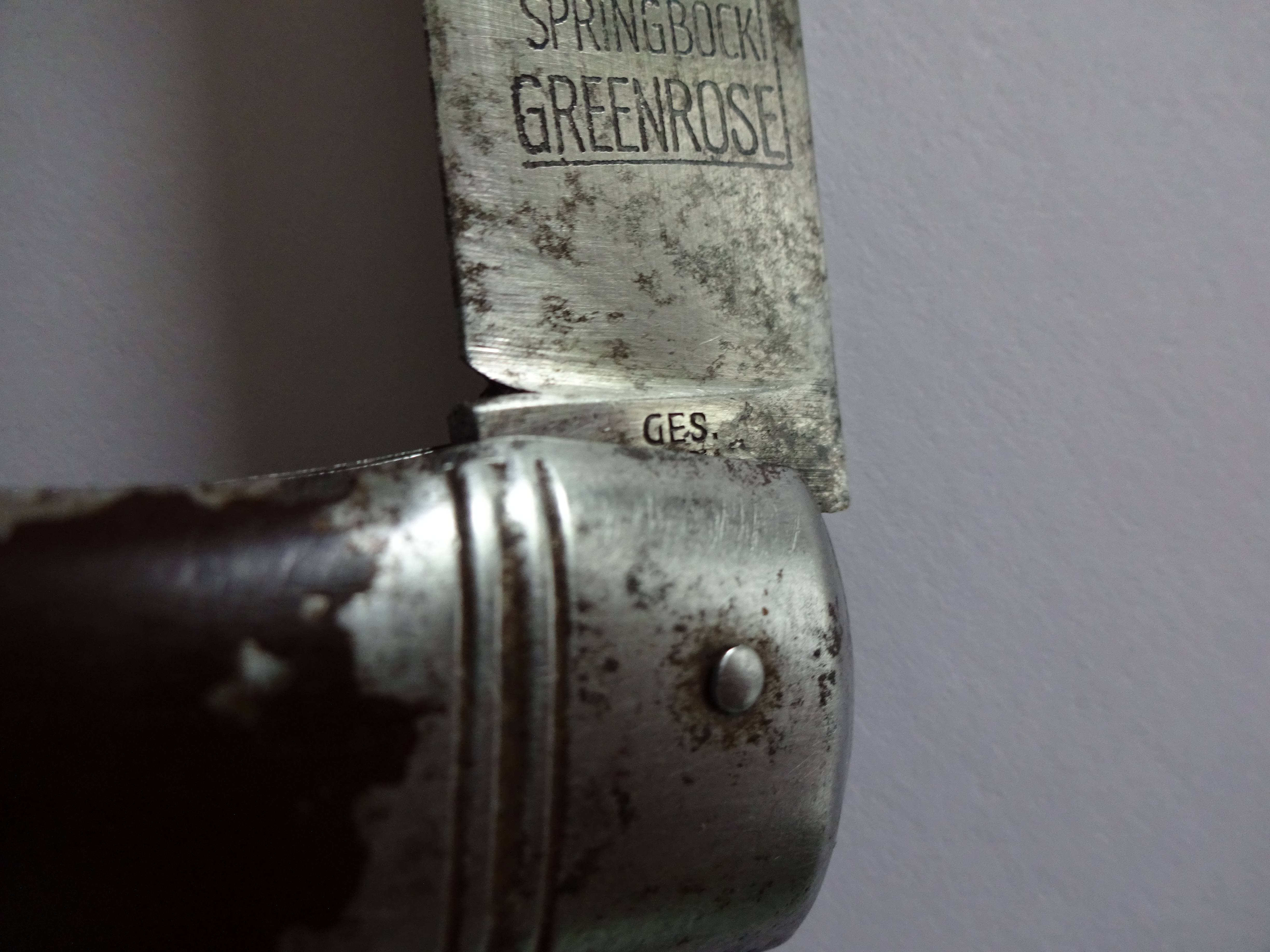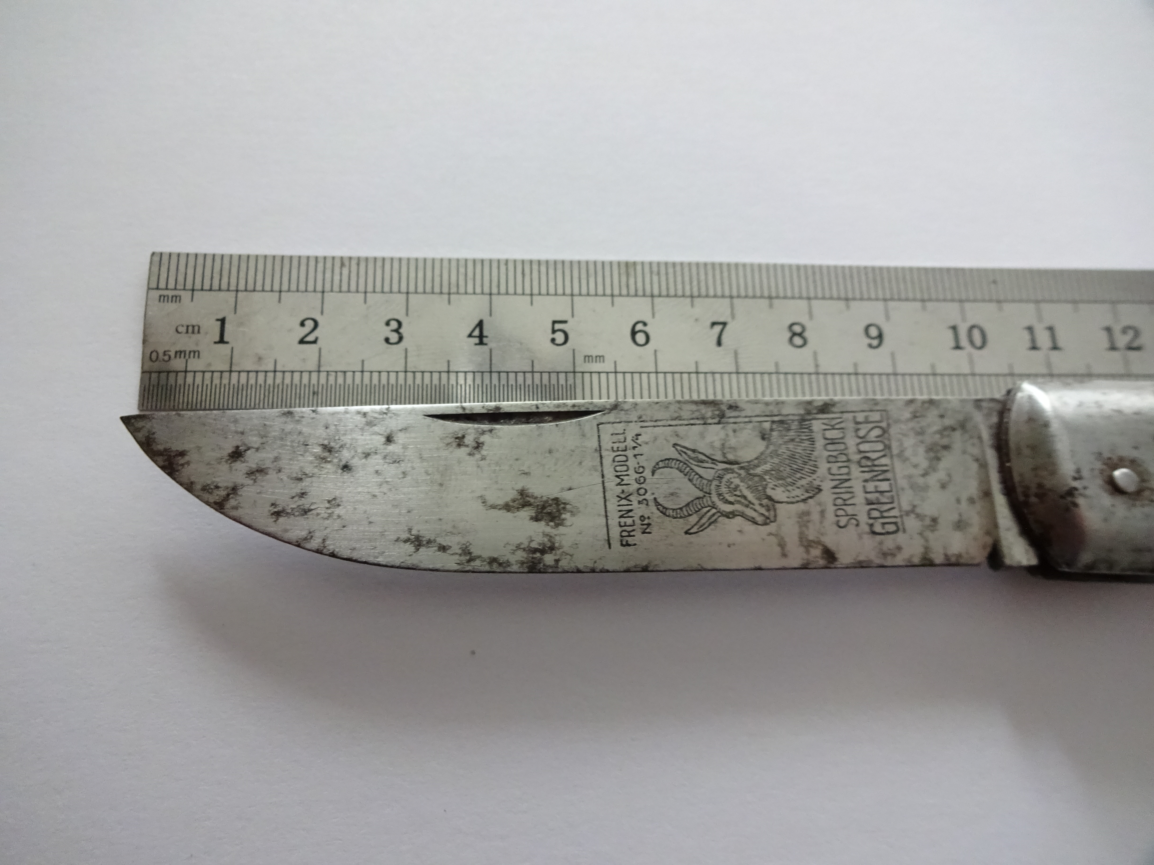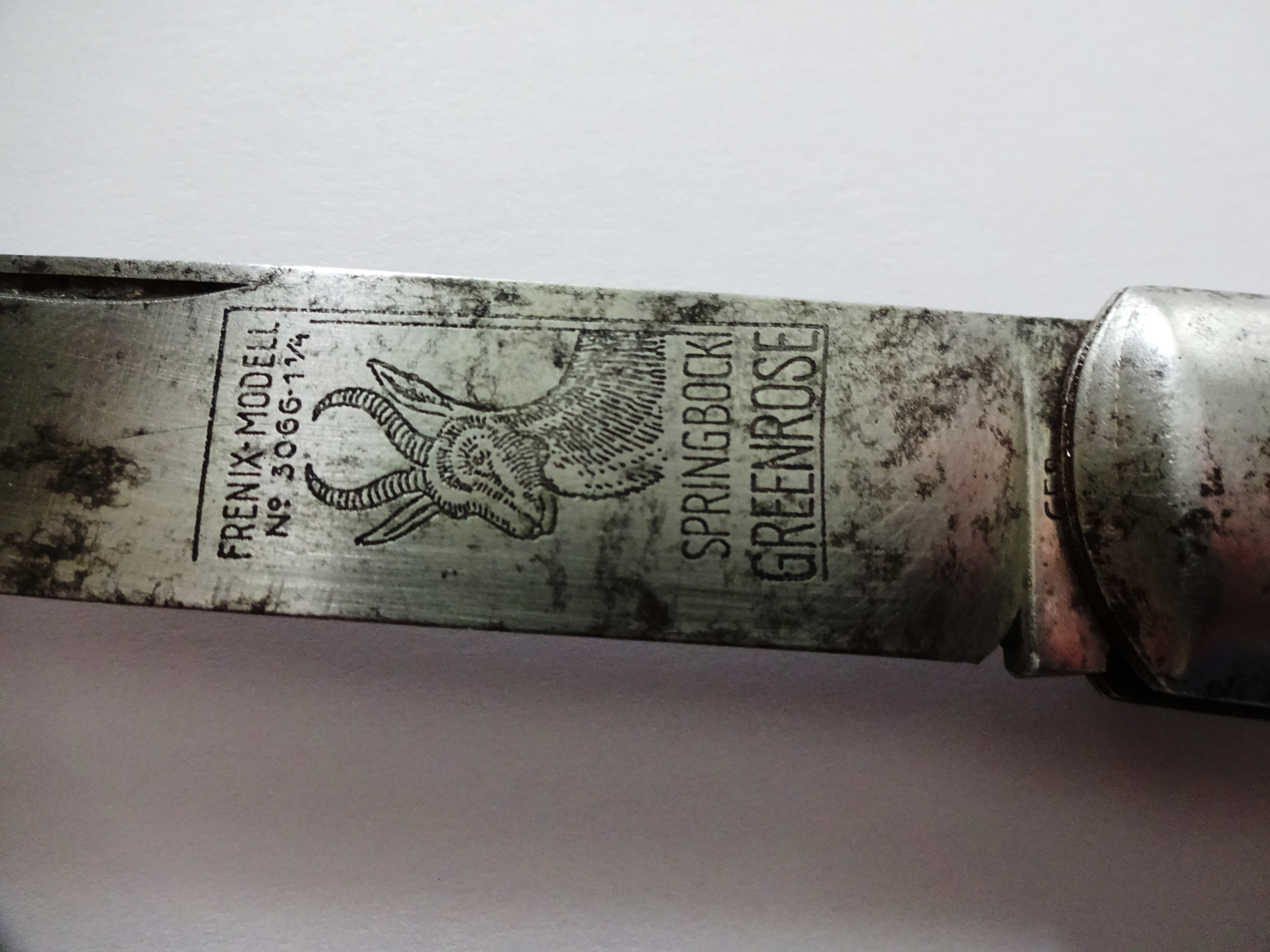 Auf der Klinge eingraviert:Frenix-Modell No 3066-1 1/4.darunter das Schulterporträt eines Springbock und die Aufschrift Springbock Greenrose.