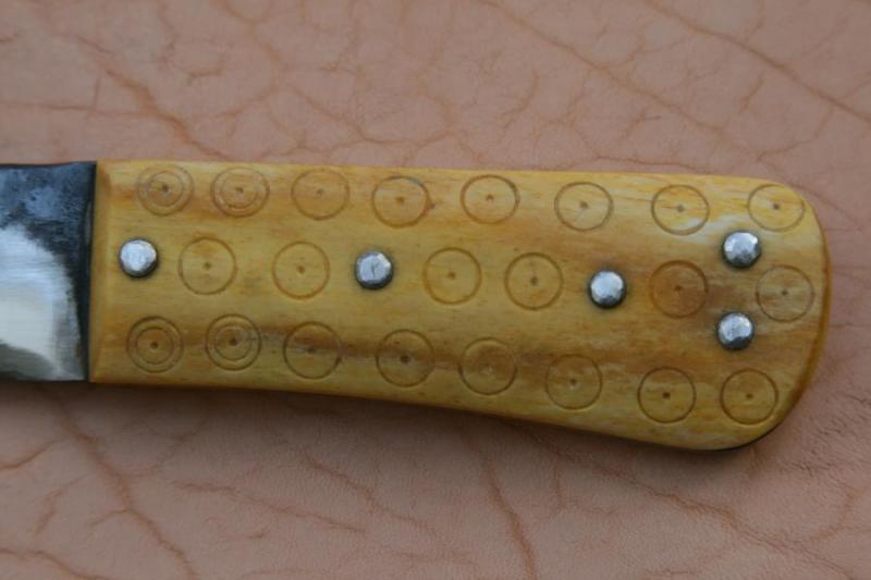 Die Klinge ist abgebrochen und ziemlich an gerostet aber man sieht noch dass das Messer recht schwer und stabil war, Die Messermitte hat eine Breite von 8mm.Die Spitze wurde vermutlich mit Gewalt abgebrochen, der Stumpf hat eine starke Biegung vor der Bruchstelle. Eine Griffschale aus Knochen ist gut erhalten.