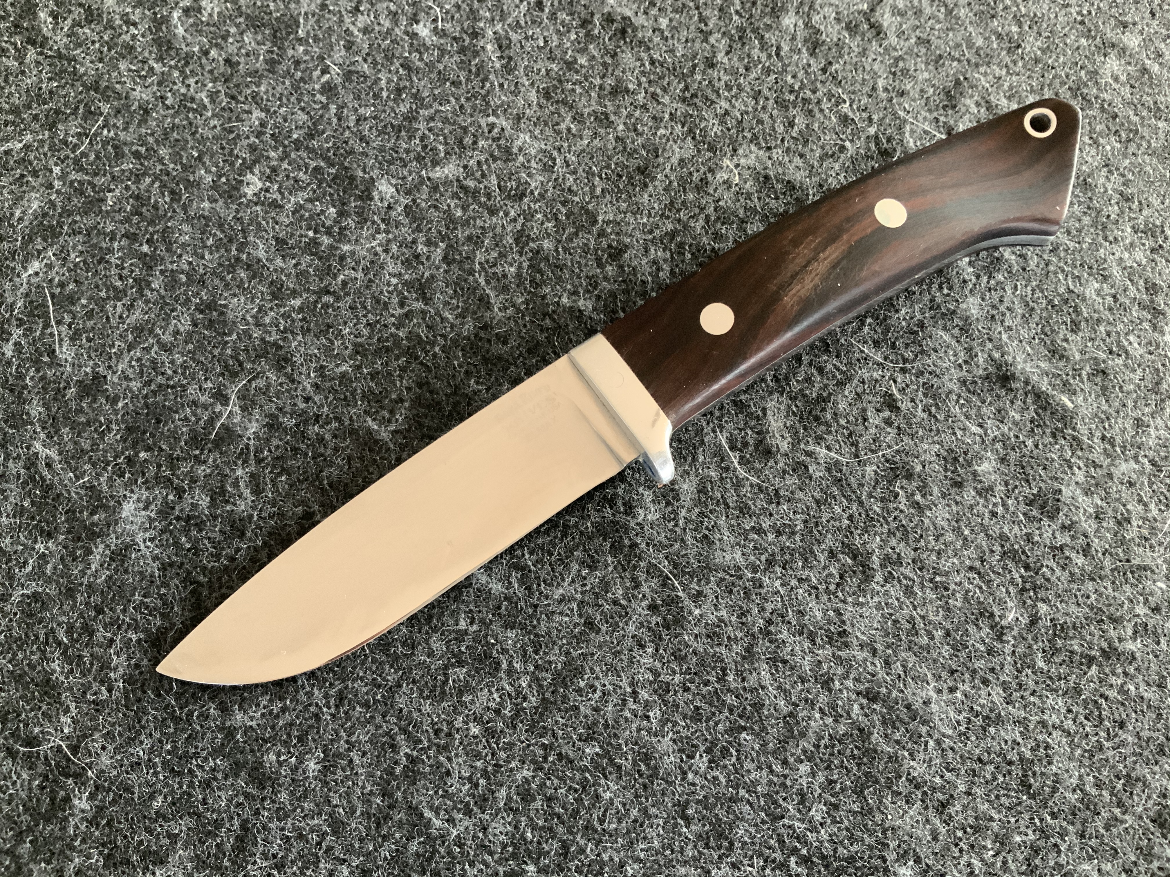 Griff: Black Linen Micarta, 110 mm lang in der Mitte gemessen, 2 Corby Bolts (Mosaic), verklebt mit 2-Ton-Epoxy, Nickel Silver Finger Guard als Abrutsch-Sicherung