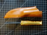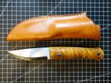 Der Stahl ist super, mit der Klingendicke von 2,5 mm ist das Messer bestimmt auch sehr schneidfähig. Die Griffschalen sind sehr schön, die Griffform ist ungewöhnlich ich kann mir aber vorstellen, dass es gut in der Hand liegt. Die Lederscheide macht einen soliden Eindruck und ist gut genäht.