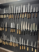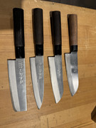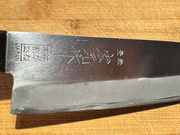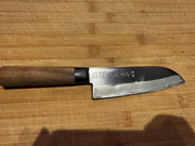Dieses Kurzsantoku habe ich vor einigen Jahren für einen sehr moderaten Preis gekauft und es hat sich in der Folge als absolutes Lieblingsmesser herausgestellt: Obwohl es nicht rostfrei ist (die Schneidlage wird nach ein paar Wochen schwarz, auch wenn man sehr gut damit umgeht) ist es das meistgenutzte Messer im Haus.