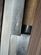 Die Länge ist aktuell noch 13,5cm, das sollte der Originallänge entsprechen. Die Breite ist aktuell noch 4cm, da könnte über die Jahre schon einiges weg sein, im Neuzustand könnte es also durchaus 4,5cm haben. Die Klinge ist ausnehmend dünne, wahrscheinlich dreilagig, sicher eher industriell gefertigt.