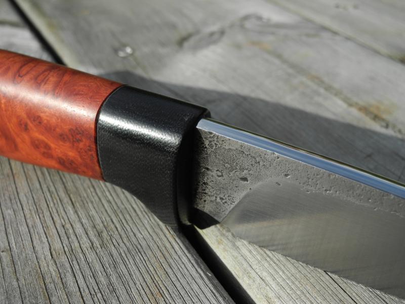 Das Parrierelement ist aus eigener Herstellung. Jeansmicarta aus 2 1/2 Jeanshosenbeinen, ist knochenhart und hat eine schöne Struktur.