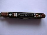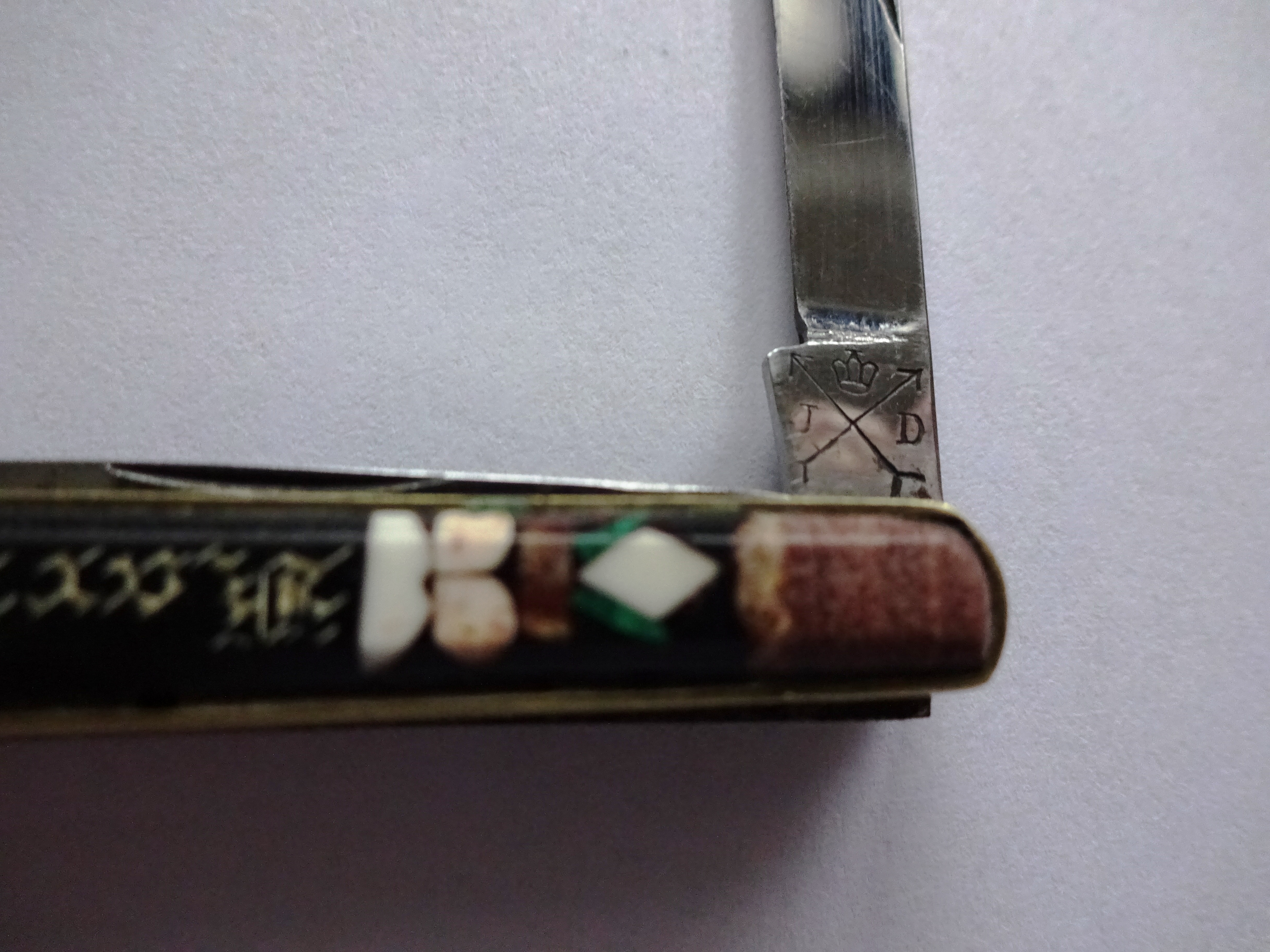 Und wem bzw. welcher Zeit ist dieses feine Herrenmesser zuzurechnen? Es hat keinen Klingenstempel, weist aber die typischen Merkmale feiner böhmischer Messer auf. Das Feinste: mein einziges mit Schalen aus Schildpatt. Dass der „Zahnstocher“ vmtl. nachgemacht ist, schmälert meine Freude an so alten Stücken nicht.