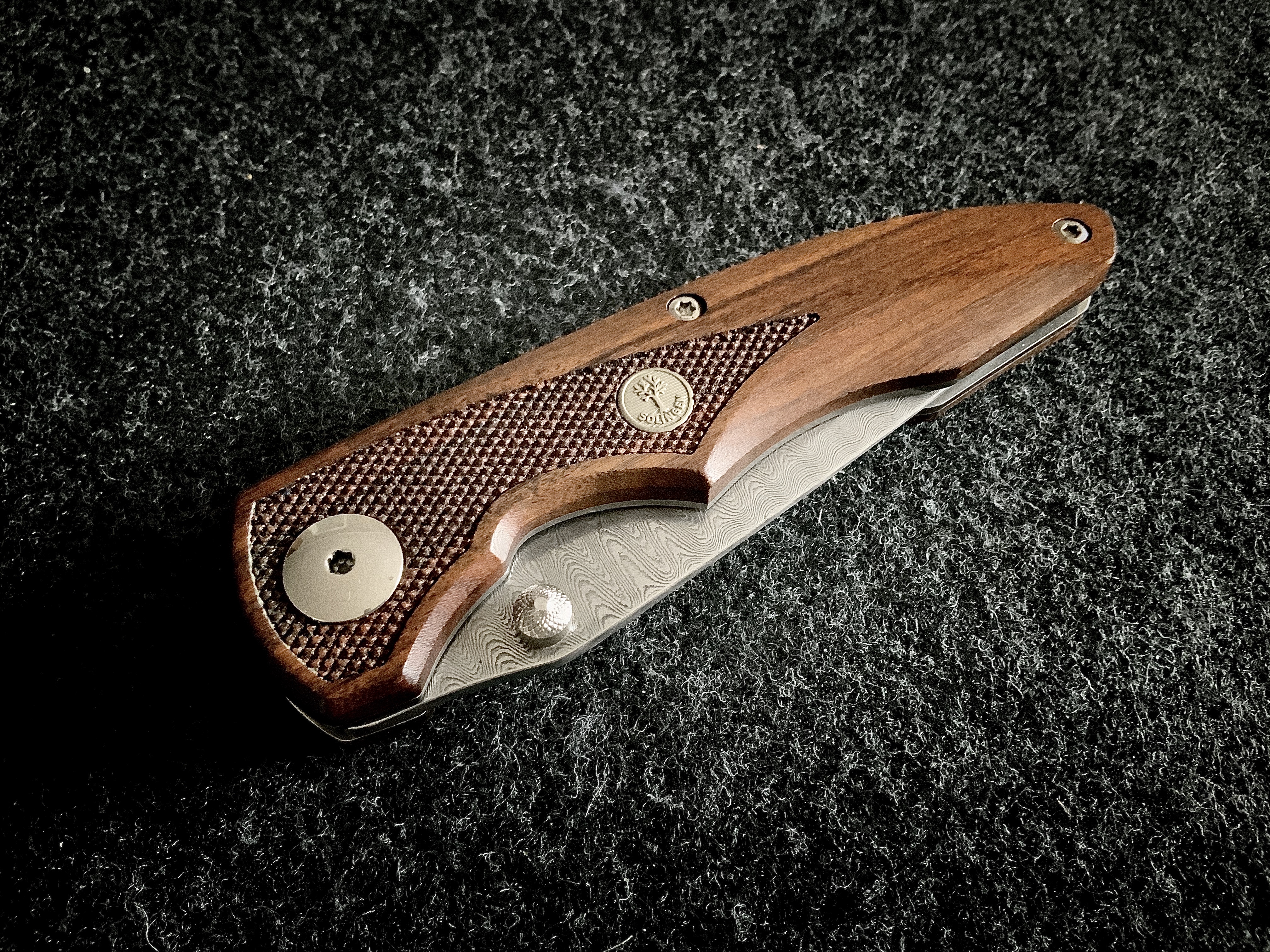 Klassische knapp 9cm Klinge in 300 Lagen Peter John Stienen Damast und ein schönes Fischgrätmuster im Palisanderholz von dem Gewehrschaftspezialisten Karl Nill. Auch der fein ausgearbeitet Daumenpin ist erwähnenswert.