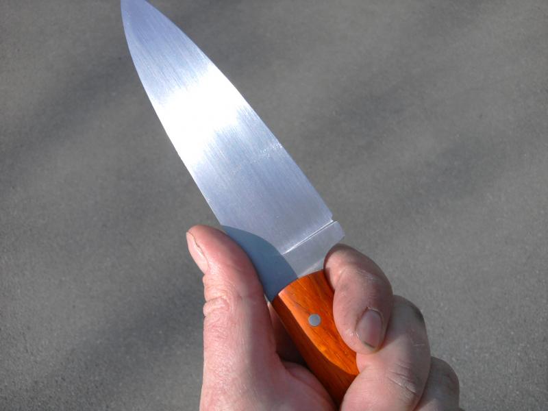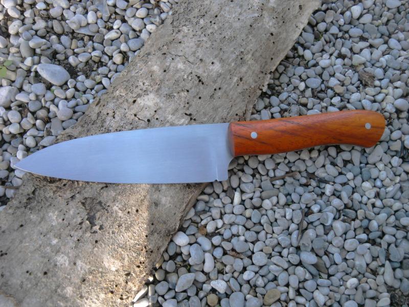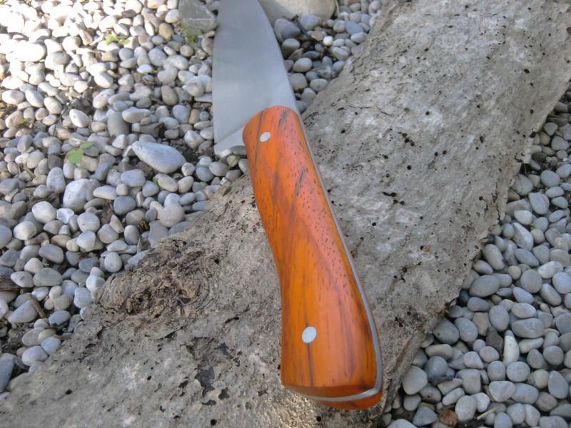 Dieses ist aus 1.1770 (Schwedenstahl von Dick) und Padouk. Pins aus VA. Mit dem Padouk musste ich mich sehr quälen, da es sich, nachdem ich es zu Griffschalten geschnitten hab, in alle Richtungen verzogen hat. Ich hoffe das bessert sich, nachdem ich es etwas länger bei mir gelagert hab.