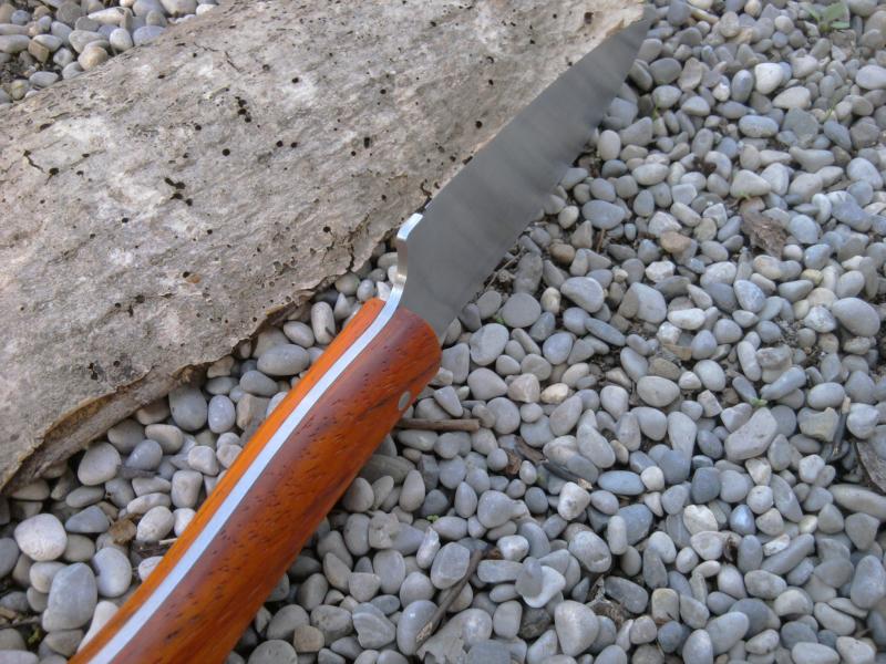 Das Brotzeitmesser entstand, nachdem hier irgendwo die Frage auftauchte, ob dieser Stahl für ein Brotzeitmesser geeignet wäre. Ja, das ist er, meiner Meinung nach, sehr gut. Er kann sehr einfach und schnell auf eine hohe Schärfe gebracht werden. Das finde ich praktischer, als einen Stahl, der zwar etwas länger scharf bleibt, der dafür aber nur mühsam nachgeschärft werden kann. Doch Vorsicht beim halbieren von Semmeln! Ich spreche da aus Erfahrung.