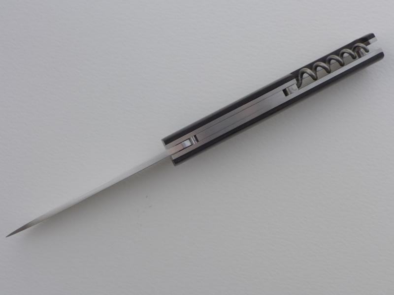 Der Korkenzieher sitzt im Rücken eingebettet in einer Aussparung im rechten Liner und der Griffschale (alternativ dazu werd' ich mal eine Version bauen, bei der der Korkenzieher mittig sitzt und die Aussparungen nur in den Linern sind – dann wäre er von den Seiten nicht sichtbar, bis auf eine kleine Fingermulde um ihn auszuklappen). Als Anschlag im offen Zustand und Feder dient ein Backspacer aus Titan Grade 5 (Federstärke 1 mm). Geschlossen liegt er am Liner an. Damit das Ganze beim Korkenziehen nicht auseinandergedrückt wird, hab ich noch ein M2-Schräubchen spendiert. Für einen finalen Funktionstest fehlten Zeit und Flasche – vielleicht ergibt sich nachher was beim Geburtstagsbrunch.