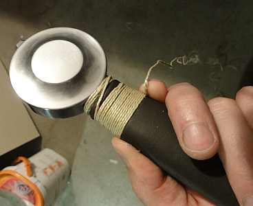 Bild drei zeigt die Schnürung mit einer stabilen Schnur. Die Schnur wird dann kurz vor der Belederung mit Leim zusätzlich bestrichen und getränkt. Nicht zuviel und auch nicht zu wenig.