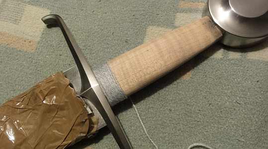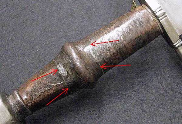 Danach das Leder nassmachen und gut auswringen so das es noch leicht feucht ist. Die rauhe Innenseite mit Leim bestreichen und um den Griff legen. Das sollte alles recht zügig gehen.....(deswegen habe ich da keine Zeit gehabt mal ein Bild zu machen.