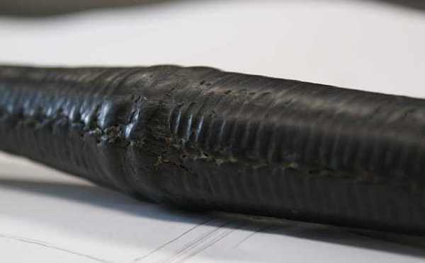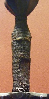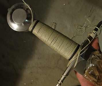 Die Schnur selbst drückt das Leder fest auf den Griff. Das Muster der Schnur wird dabei in das Griffleder eingeprägt. Hier sollte man schön gleichmäßig arbeiten. Nur an der verstärkten Schnürungen oben und unten am Griff habe ich die Press-Schnürung nicht angelegt. Austretenden Leim sollte man sofort abwischen.