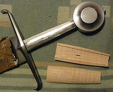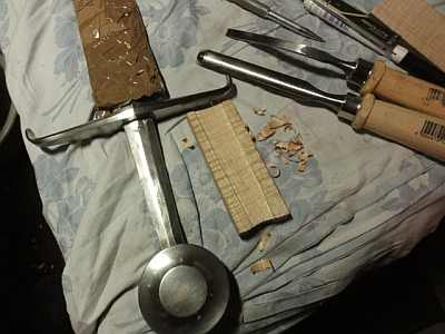 Material ist in diesem Fall Ahorn. Die Schalen sollten richtig schön stramm zwischen Knauf und Parierstage passen. Danach die Umrisse der Angel aufzeichnen und mit Stechbeiteln und Raspeln ausarbeiten.