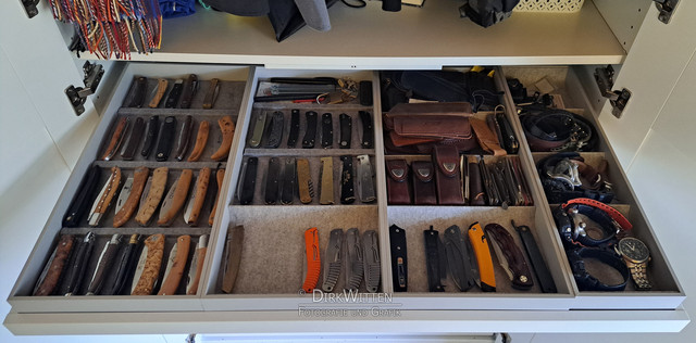 Der Vorteil der Kleiderschranklösung liegt für mich immer noch darin, dass ich die Messerchen direkt griffbereit habe, wenn ich mich anziehe - langfristig brauche ich eine zweite Schublade für die etwas beengten Uhren und die Lederfutterale und Stecketuis, aber das ist kein Problem, die Schublade liegt ja seit Jahren originalverpackt im Abstellraum.