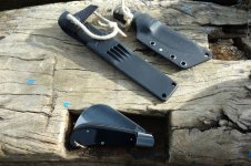 seit einigen Tagen probieren wir im Vergleich miteinander verschiedene Messer hinsichtlich ihrer Eignung als Schnitzmesser aus. Wir haben dabei bisher eine klare Präferenz für Folder gehabt - praktisch, sowieso immer dabei, bequeme Handhabung. Wir haben ja auch eine schöne Auswahl an edlen und scharfen Taschenmessern angesammelt. Gestern haben wir zur Abwechslung mal ein Fixed, Little John, mitgehabt und einigermaßen filigrane Schnitzarbeit damit verrichtet. Heute haben wir das noch größere Fällkniven F1 benutzt.