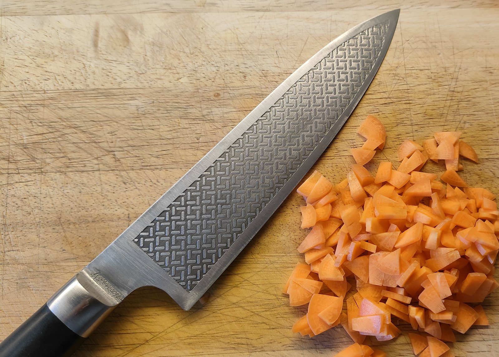 Es hat einen leichten Schnitt und ist komplett nagelgängig. Beim schneiden von kalten Möhren sind 2/3 des Einschnittes knackfrei beim letzten dritte hört man ein ganz leises ratschen. Die Schnittfreisetzung ist dabei gut und das Schnittgut saugt sich nur minimal fest. Es lässt sich aber leicht abstreifen. Für mich vollkommen ausreichend.