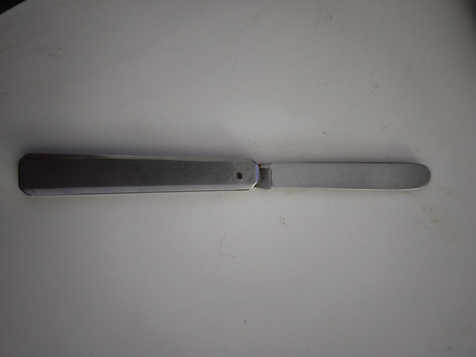 Gesamtlänge 17 cm , Klinge 7 cm , runde Spitze und im unteren Ende der Klinge ist es mit Sägefunktion (scharfe Einkerbungen)