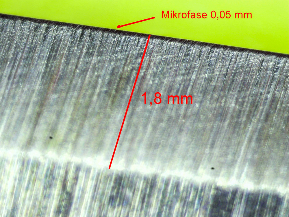 1,8 mm Fase mit Winkel ab Werk (gemessen mit einem Goniometer) 34 Grad und 0,05 mm Mikrofase ...