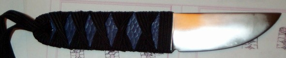 Mal was japanisches: Ein kleiner Aikuchi aus 1.2842, selektiv gehärtet von Claymore - Gesamtlänge 16cm, Dicke 4mm. Geschliffen wurde bis 1000er Politur und anschließend poliert, in heißer Zitronensäure geätzt und überpoliert.Der Hamon, die Härtelinie, ist auf dem Foto vor allem im Bereich der Spitze zu erkennen. Der Erl ist mit blauem Biberschwanzleder beklebt, darüber eine Baumwollkordelwicklung im Diamantmuster (Wicklung