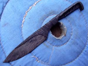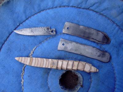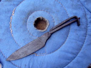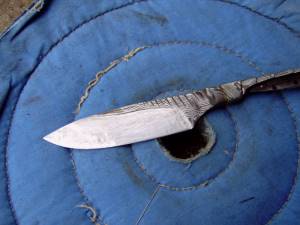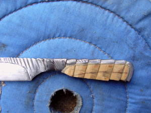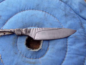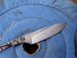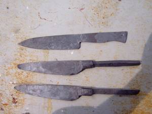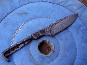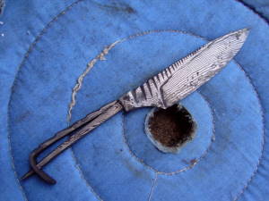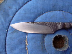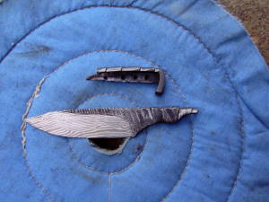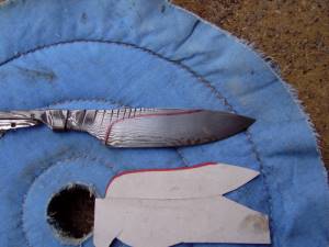 Bild 55- 57: Jetzt kommt die Schablone wieder zum Einsatz. Beide Seiten der Klinge werden angerissen. Und mit dem Stichel wird die Kontur gezogen. (Habe ich im Eifer vergessen zu fotografieren) Danach wird das ganze wieder gleichmäßig ausgeschliffen. Auf der einen Seite sind auch schon die Schuppen weiter vorgeschliffen.