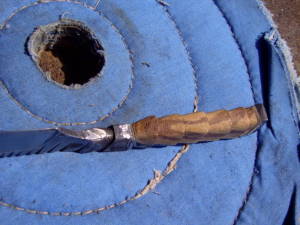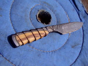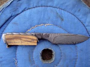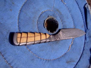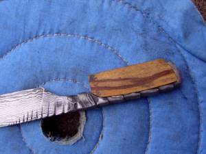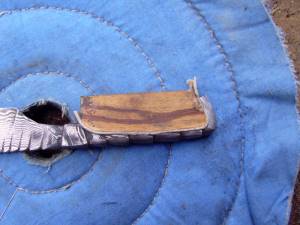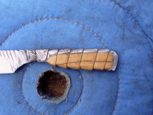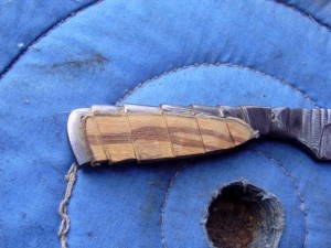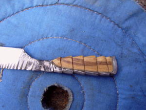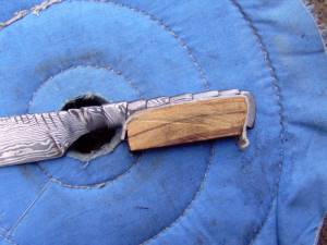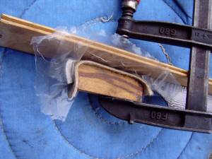 Danach habe ich das Griffholz an der Klebefläsche auch mit Epoxy bestrichen und das ganze in den Griff gepresst. Die Folie dazwischen sorgt dafür, dass das Ganze nicht am Messer klebt sondern nur die Form bekommt.