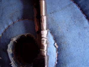 Bild 50 u. 51: Die Zwischenlage die hier zu sehen ist ist Wollstoff (2 Lagen). Diese habe ich vorher mit Epoxy bestrichen und gepresst. Jedoch nur soviel, das es noch flexiebel bleibt. Die eigendliche Stabilisierung erfolgt erst bei der Weiterverarbeitung.