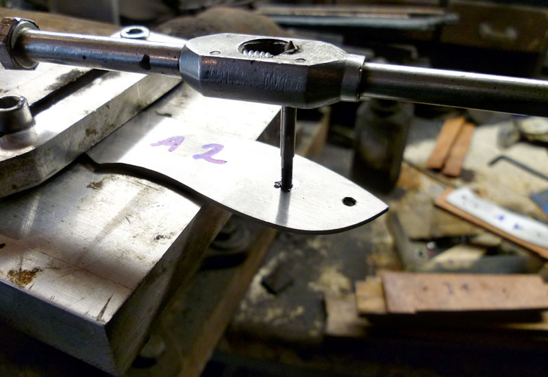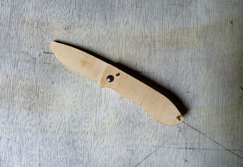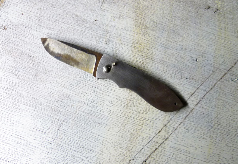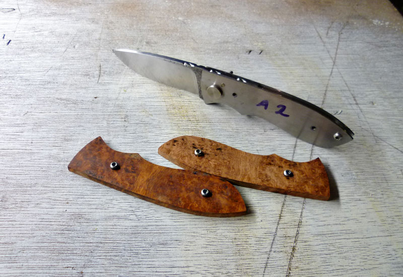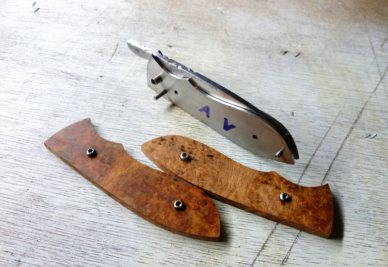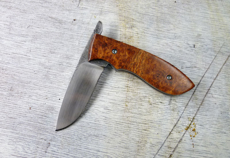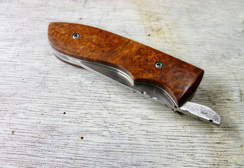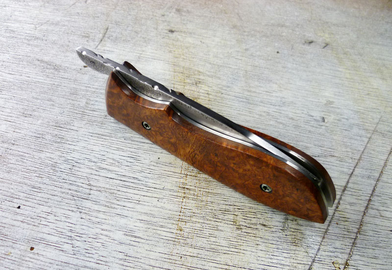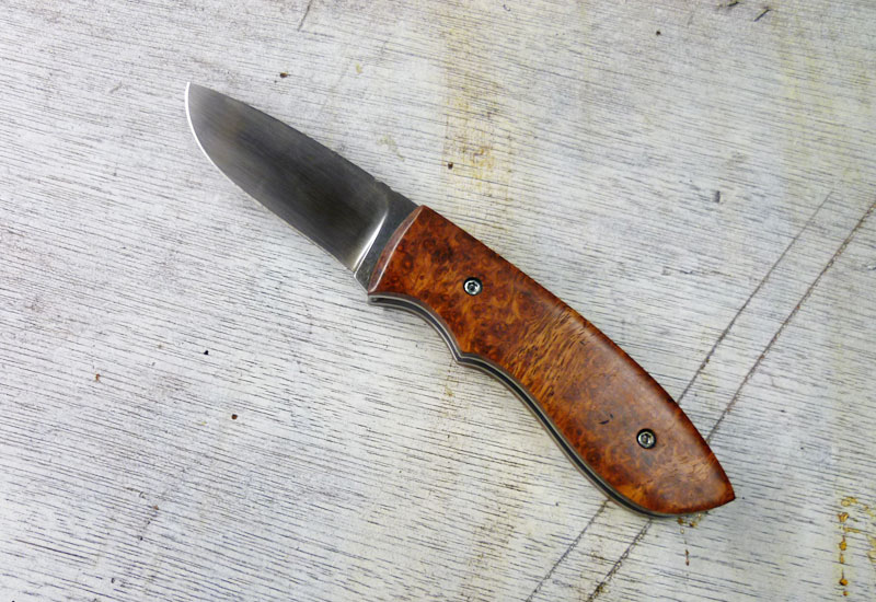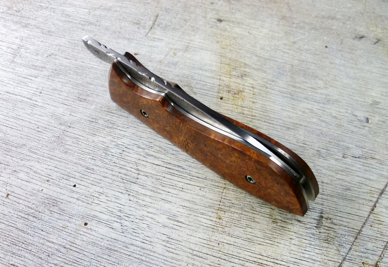 Der Griff ist aus Amboina-Maser und die Platinen sind aus rostfreiem Federstahl mit 1,5mm. Die Klinge ist aus 1.2442.