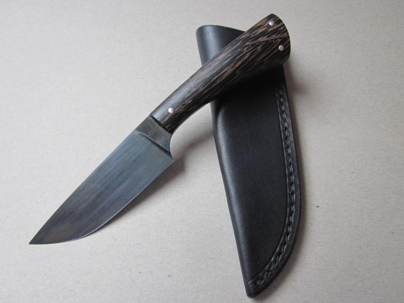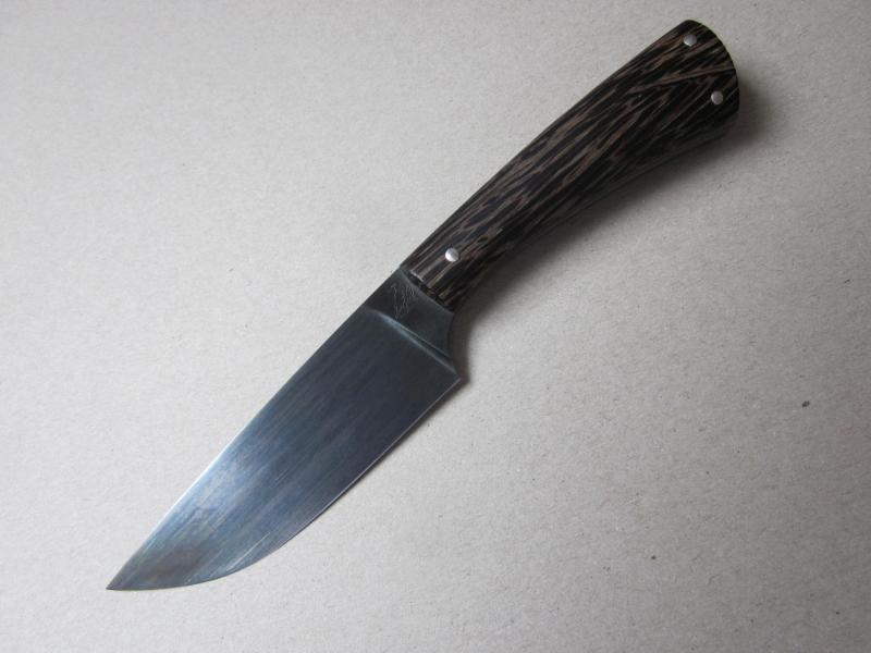 Länge gesamt 18,5 cm, Länge Klinge 9 cm, Breite 3 mm, Klinge brüniert, Griff Palmholz gebürstet mit Silbernieten. Den Stahl hatte er mir genannt, ich habe es leider vergessen