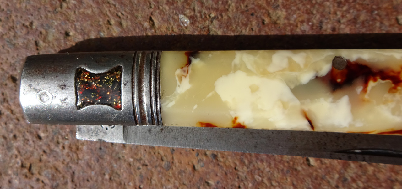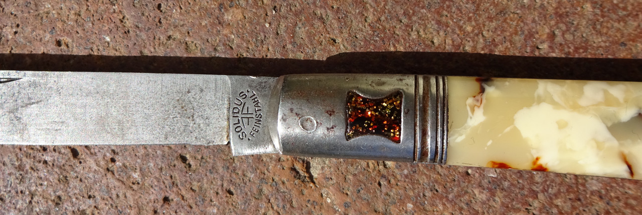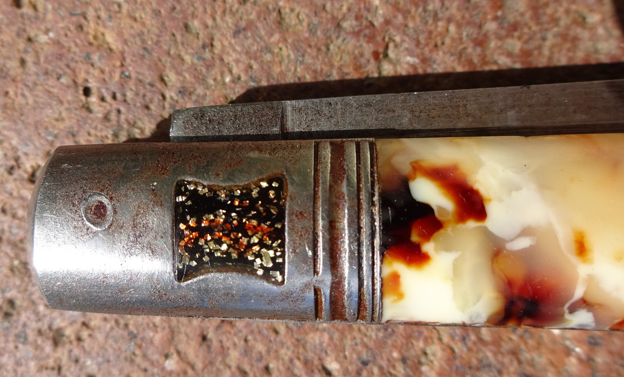 Bemerkenswert die Griffschalen und die Einlegearbeit im Metall des Messergriffes.