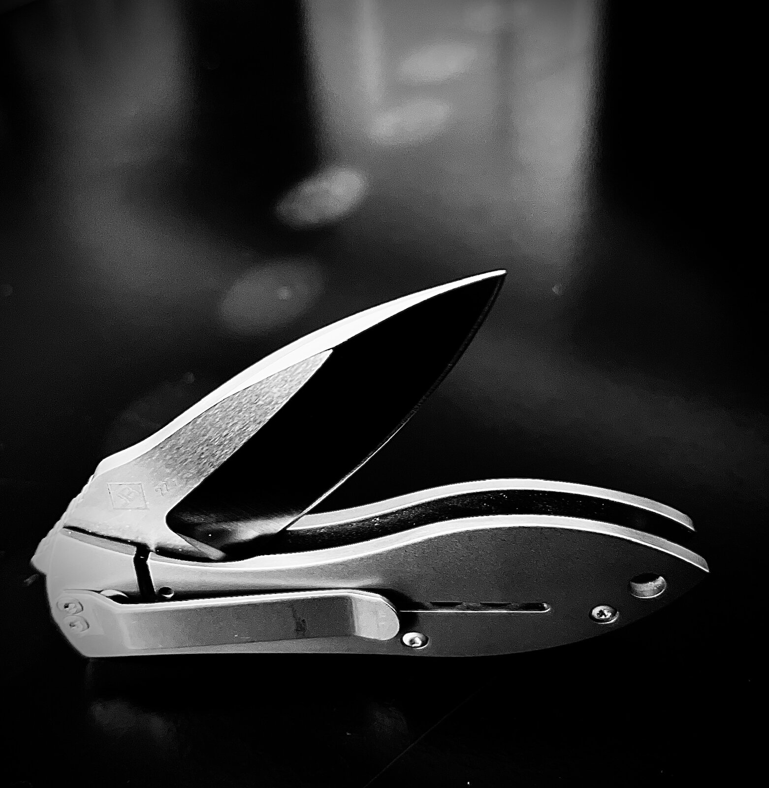 Schwingt man die Klinge mit dem Flipper aus, wird das zuvor zweidimensional wirkende Logo auf der linken Backe dreidimensional beziehungsweise hebt sich.