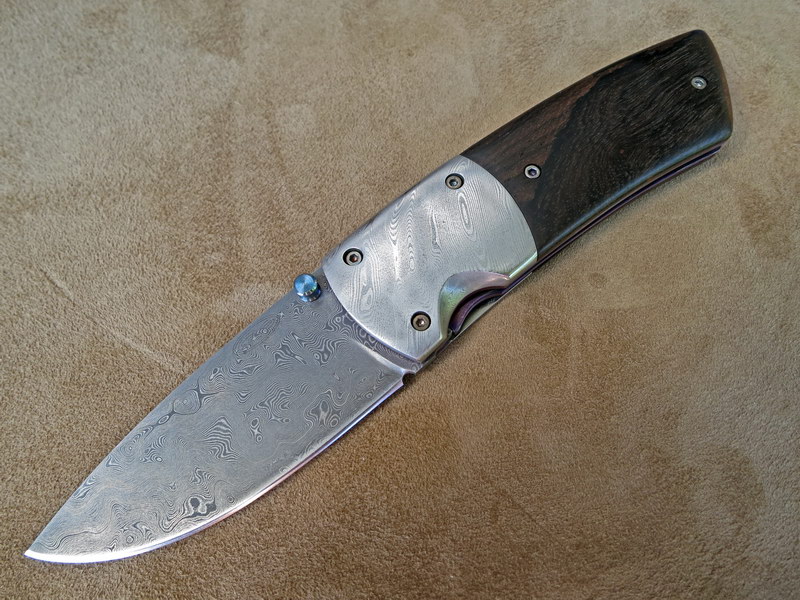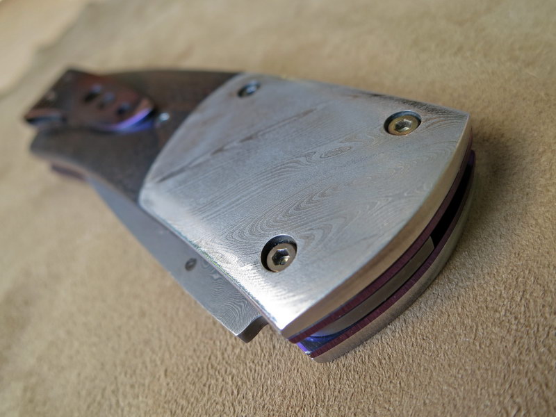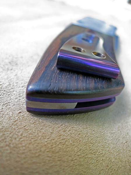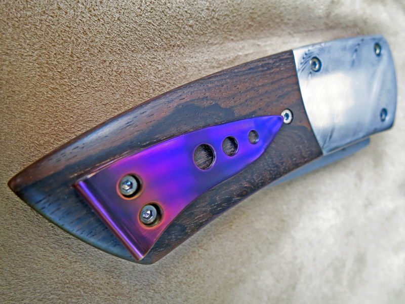 Liner und Clip aus anodisiertem Titan, Bolster und Spacer aus Torsionsdamast, Daumenpin aus V2A hitzecoloriert, Griffschalen...hmmm kann da wer helfen? - keine Ahnung...