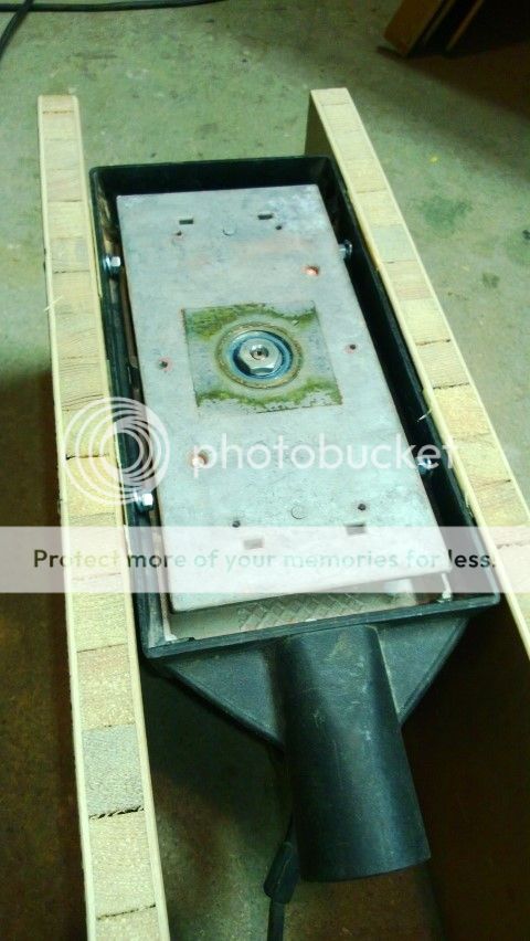 Dazu habe ich zwei Bretter genommen (das Zeug lag rum, war mal ein Schrank..) und zwischen diesen die Absaugung des Schleifes angeschaubt. Außerdem habe ich zwei Querbretter zusätzlich verbaut, die auf jeder seite mit jeweis 2 Schrauben befestigt sind.