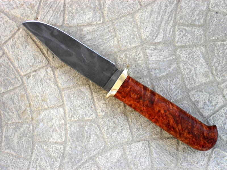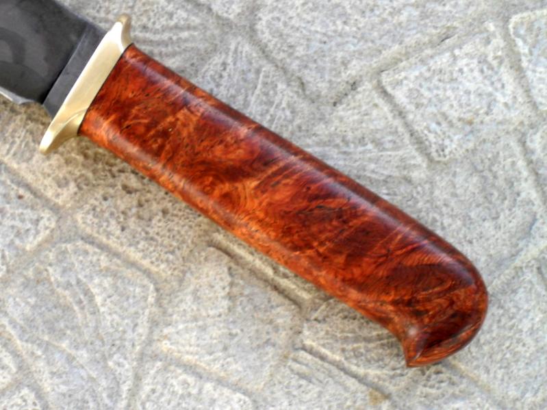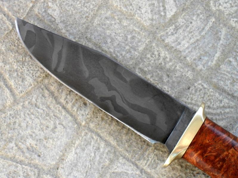 vor einiger Zeit hab ich beim Ausleeren meiner Schrottkiste 4 Klingenrohlinge vorm Schrottcontainer gerettet. Die Dinger hatten alle Schweißfehler oder waren irgendwie verschliffen, kurz, Ausschuß. Und weil ich einfach nix wegwerfen kann, kriegten sie eine 2. Chance. Ich hab die 4 zu einem 4-Kant zusammengeschweißt, den 4-Kant tordiert und ausgeschmiedet. Leider ist das Muster nicht so geworden, wie ich mir Torsionsdamast vorstelle, aber, "again what learned", wie Lodder Matthäus sagt. Herausgekommen ist ein Messer mit Bowie-Klinge, 110 mm lang, 4 mm dick, Griff ist Amboina. Nachdem ich sah, dass es wohl kein weltbewegendes Klingenmuster geben würde (Kunststück, alles relativ ähnliche Kohlenstoffstähle), hab ich nicht lang/tief geätzt.