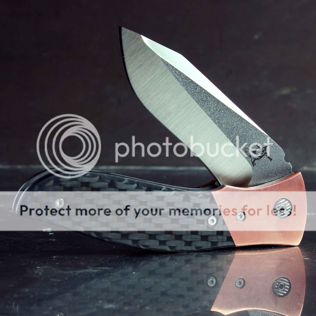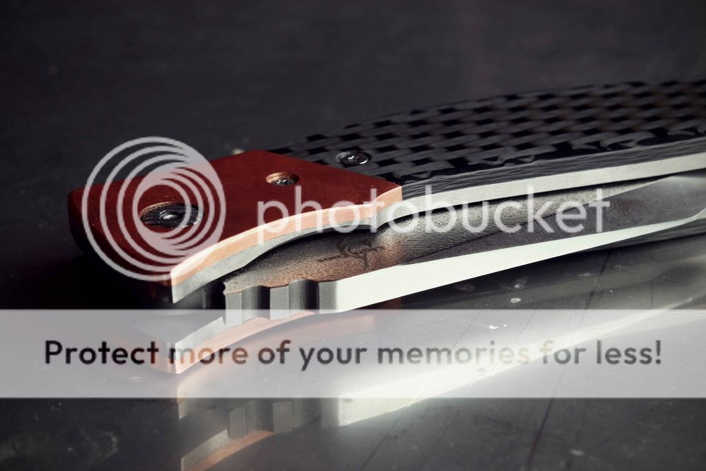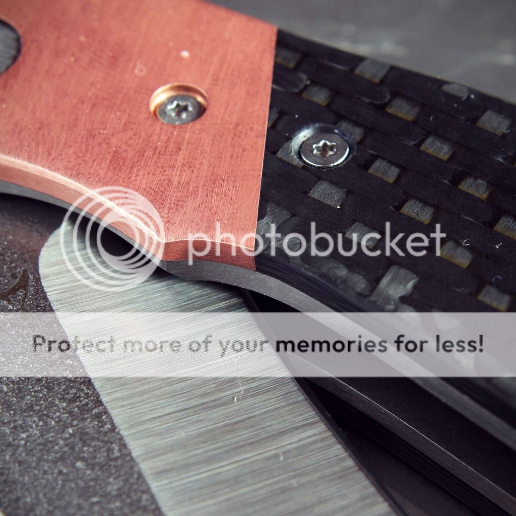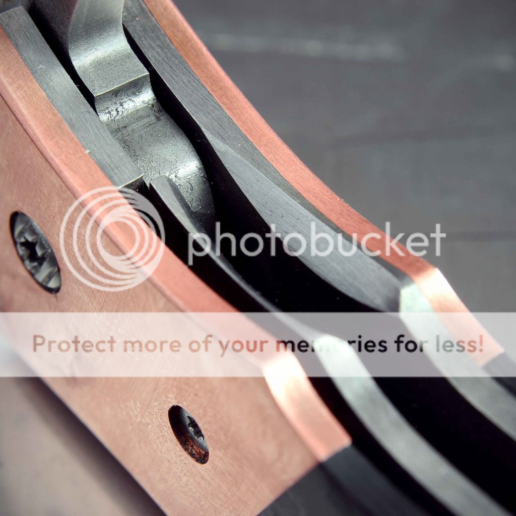 Grober Zuschnitt, Passung zwischen Bolster und Carbon von Hand gefeilt, Löcher gebohrt, alles verschraubt und dann alles beigeschliffen. Hört sich nach nicht so viel Arbeit an, hat mich aber einige Grübelei und Zeit gekostet. Vorallem das Carbon war extrem unschön zu Bohren. Das Kupfer dagegen wollte nicht so recht geschliffen werden. Aber es hat dann doch irgendwie alles gepasst und sogar die Spaltmaße passen erstaunlich gut. Auf einen Clip habe ich bewusst verzichtet, in letzter Zeit trage ich recht viele Messer lose in der Tasche. Um den Klingengang zu optimieren habe ich die Kugeln ordentlich gefettet und die Bahn des Detends mit Grafit behandelt. Hat erstaunlich viel gebracht.