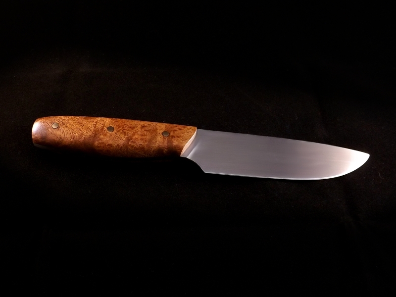 ... Myrthe Maser, genauer gesagt. Die Klinge ist aus CK75, 4mm stark. Der Anschliff ist ballig und etwas dicker, somit sollte die Klinge einiges wegstecken. Die Gesamtlänge beträgt 225mm. Die Klinge ist davon 115mm lang.