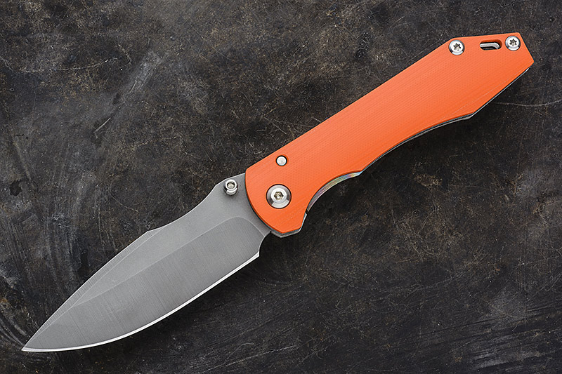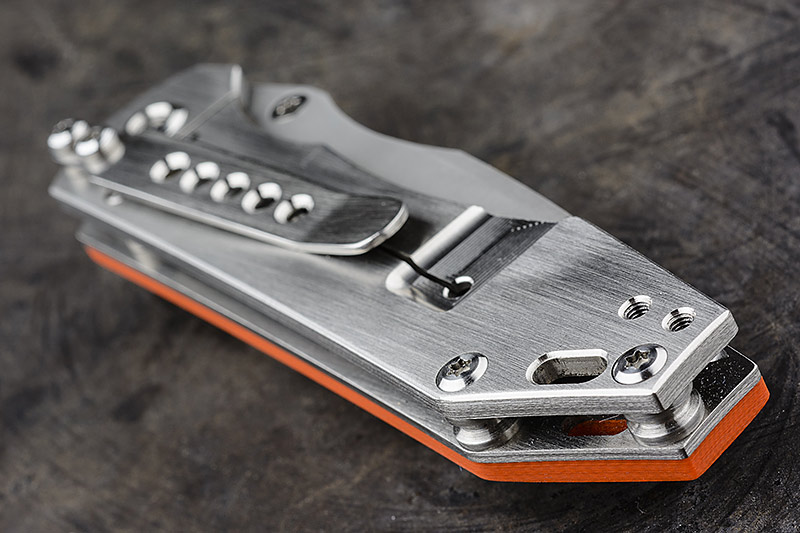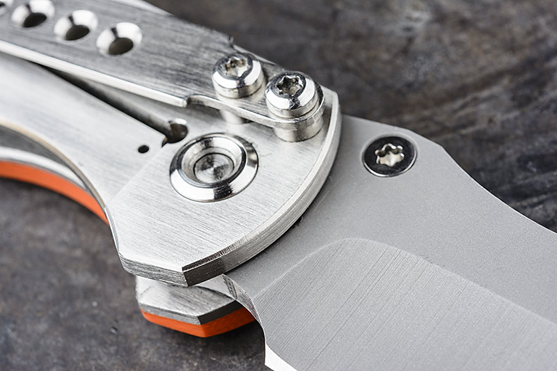 Achsposition und der vordere Bereich des Griffs wurden gegenüber dem SHBBS verändert. Beim zugeklappten Messer liegt jetzt die Klingenrampe komplett innerhalb des Rahmens. Kleines Detail: Der Öffnungspin ist hoch genug, so dass man bequem ran kommt, steht aber nicht über den Griff hinaus. Überstehende Pins finde ich optisch furchtbar, zu kleine furchtbar unpraktisch :D