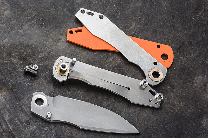 Spacer, Anschlagpin und Achse sitzen mit enger Passung in den Platinen. Das Ding baut man zusammen wie einen Steckbaukasten, da verschiebt sich nichts und hinterher funktioniert das Messer wie im Originalzustand. Die Gleitscheiben sind recht groß; das zentriert die Klinge gegen den Druck der Feder und hilft, das Klingenspiel feinfühlig einzustellen.