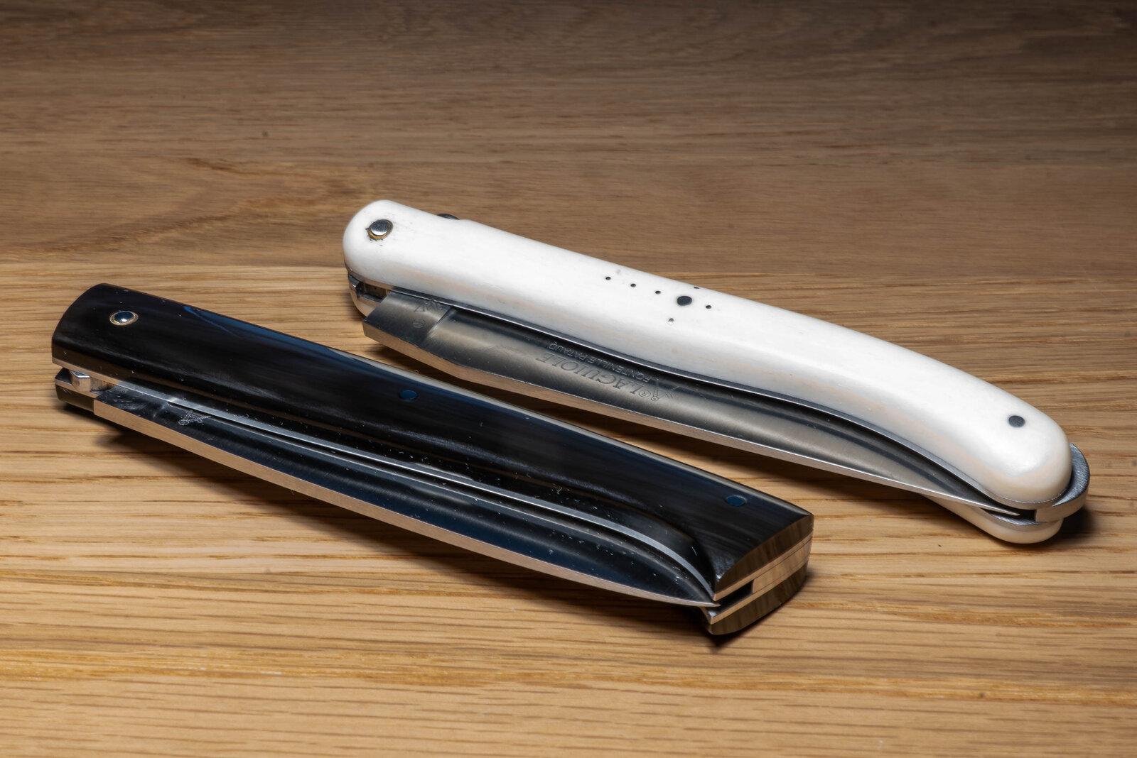 Das Messer ist wunderschön, eingeklappt wie ausgeklappt und FP-typisch perfekt in der Detailverarbeitung. Die Hornspitze hat im Licht eine schöne Tiefe, das FP-Logo ist schön dezent eingelasert, so wie Adriens Initialen zum Schluss seiner eigenen Fertigung. Gedauert hat das Ganze ab Auftragserteilung keine vier Wochen, angesichts des offensichtlichen Weihnachtsstresses in Thiers ganz wunderbar! Kommunikation mit Yann war wieder mal top!