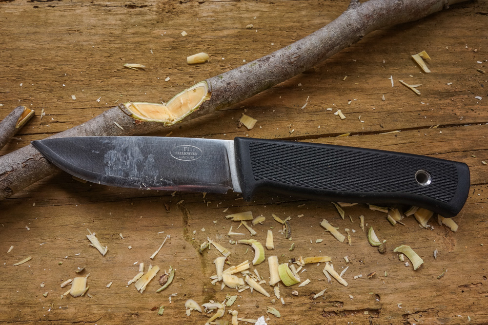 . Die 3 mm starke Knusperrinde muß runter, kleine Verästelungen kommen ab. Es knuspert, knackt und raspelt. Eine Herausforderung für die Klinge.Trotz des relativ hohen Gewichts läßt sich mit dem Province über längere Zeit ermüdungsfrei arbeiten. Der zunächst gewöhnungsbedürftige - etwas voluminöse - Griff stört nicht. Auch feinere Arbeiten beim Entrinden des Knüppels gehen gut von der Hand.